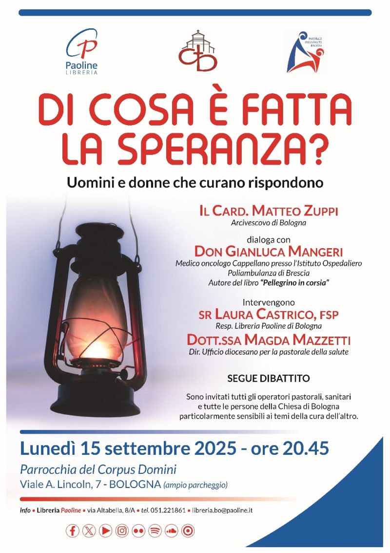 “Di cosa è fatta la speranza ?“, se n’è parlato lunedì 15 settembre 2025 alle 20:45 c/o la Parrocchia Corpus Domini Viale A. Lincoln 7 Bologna, con il Card. Matteo Maria Zuppi, Don Gianluca Mangeri, Suor Laura Castrico e la Dott.ssa Magda Mazzetti, e con il contributo di testimonianze e dibattito.